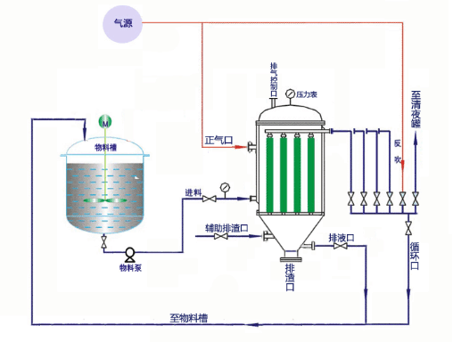 3、在過濾后期,如底部殘留料漿不能排回料漿槽,這時可用泵抽出底部的殘留料漿,再返回頂部中央的過濾機頂蓋內(nèi),并通過噴嘴均勻噴灑到過濾管上,通過機內(nèi)輸入壓縮氣體使殘留的液體全部濾出。