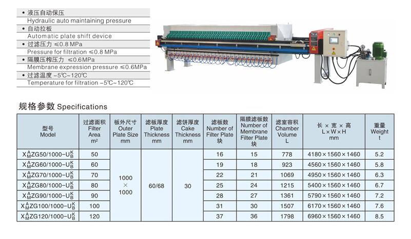 5、隔膜濾板的擠壓有氣壓榨和水壓榨兩種選擇,壓榨壓力范圍為0.5?1.6 MPa;